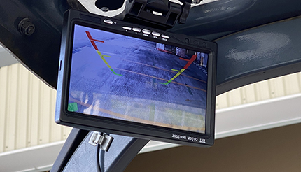 カウンターフォークリフトは車両の特性上、後方に多くの死角が存在します。この後方視界確保のためサイド/センターミラーに加えバックカメラを搭載。目視補助として活用することで後方死角を限りなくゼロにし衝突や接触防止に役立てています。