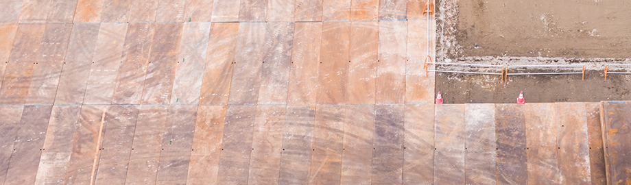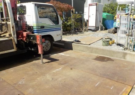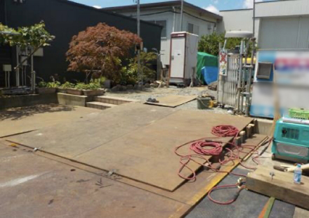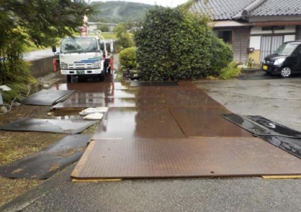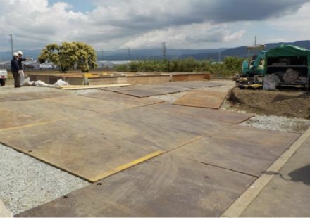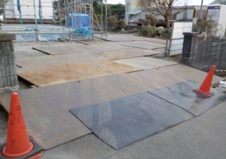 敷き鉄板はクレーン・重機の作業場、車両の進入路における軟弱地盤の養生、歩行者用通路の確保、資材置場・作業場の床材など、様々な場面で使われています。